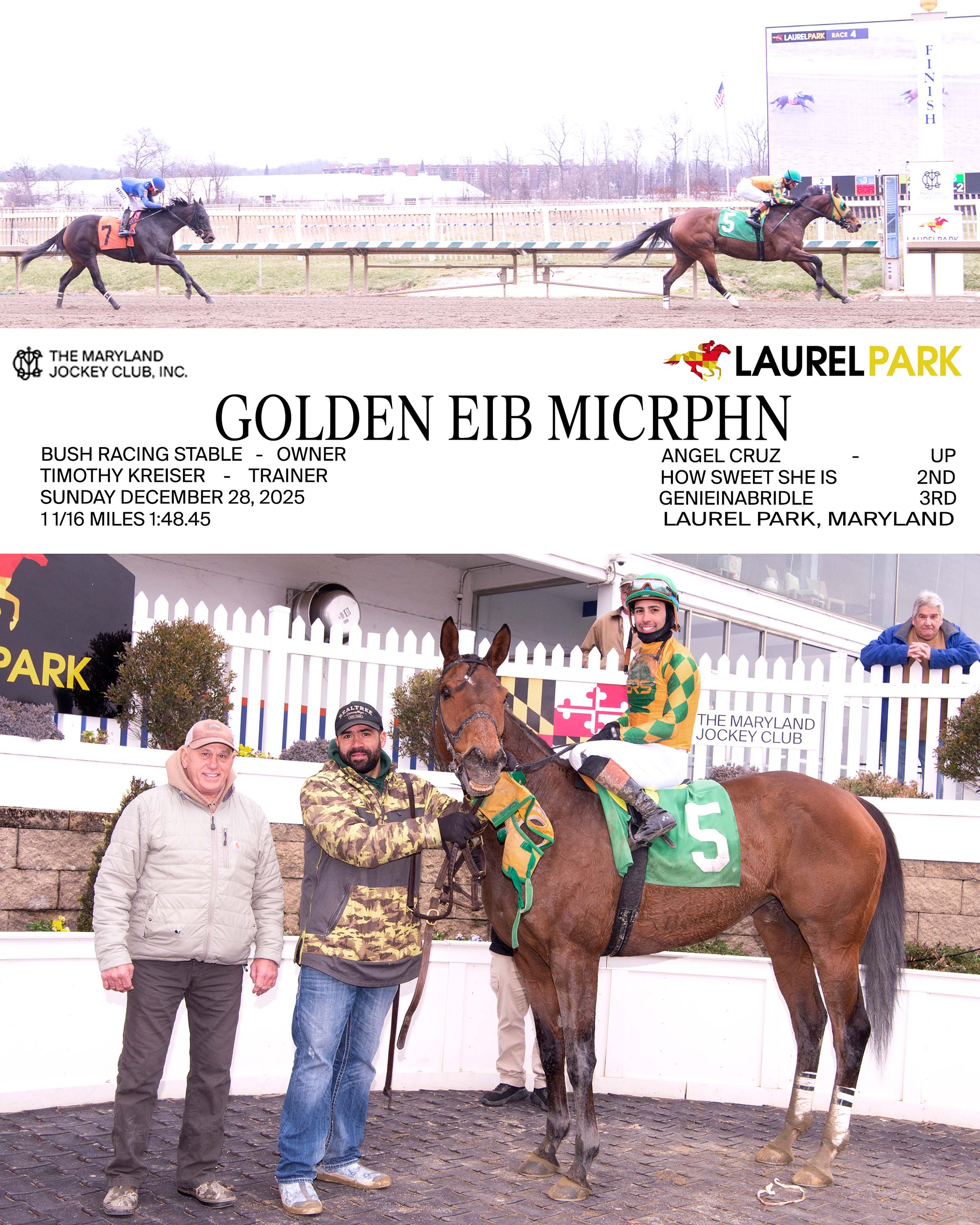 | Dec 28, 2025 | Laurel Park | OC12k/SAL8k | 1 1/16m | 1st/6 | $14,400 | PDF | Picture | Video |
