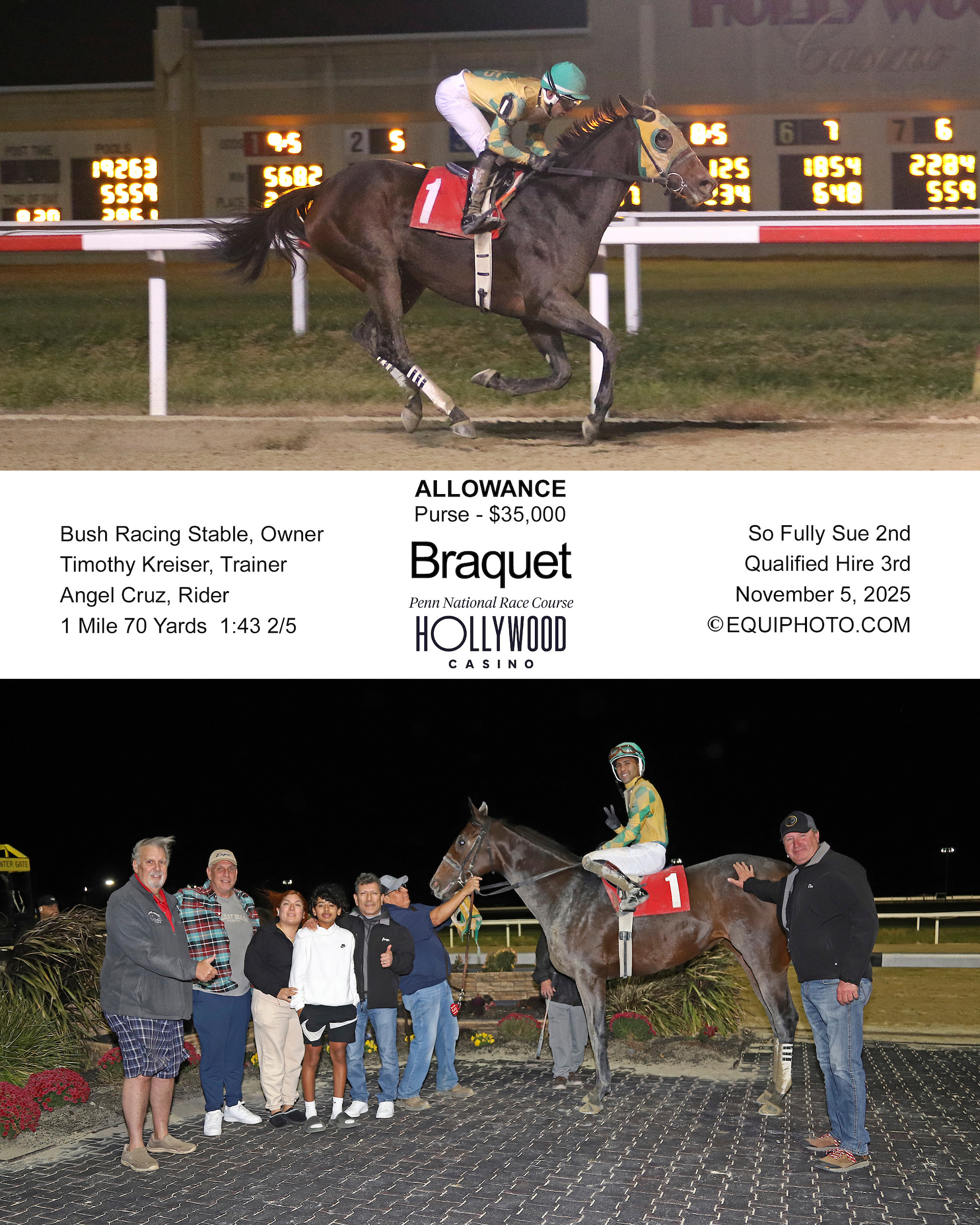 | Braquet | Nov 5, 2025 | Penn National | Alw 35000n1x | 1m70y | 1st/6 | $21,000 | PDF | Picture | Video | 2025 |